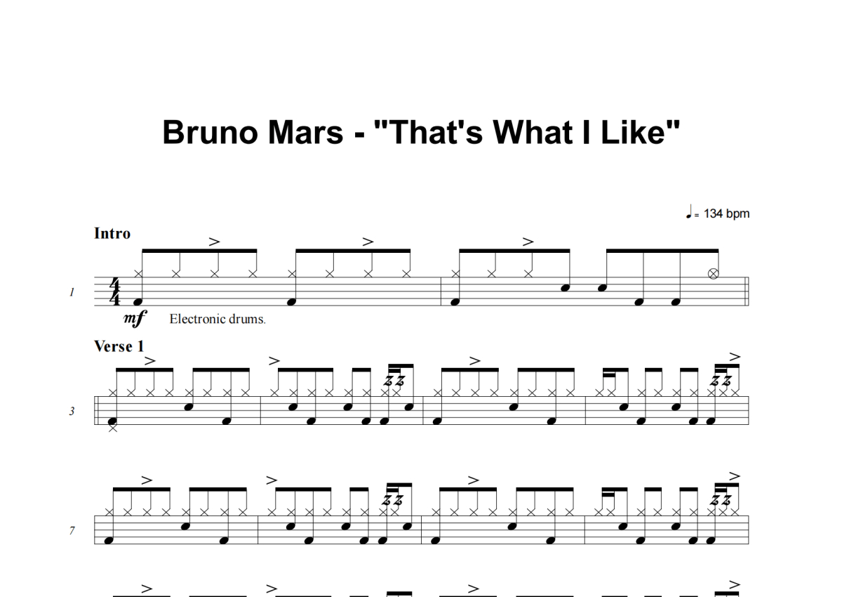 《That's What I Like》是Bruno Mars演唱的一首歌曲,这份架子鼓谱共有四张高清图谱,图谱由 @失眠的土豆 编配上传,图谱使用五线谱编配,使用这份That's What I Like架子鼓谱,你将能够轻松地敲打出这首Bruno Mars的That's What I Like,快来尝试吧。