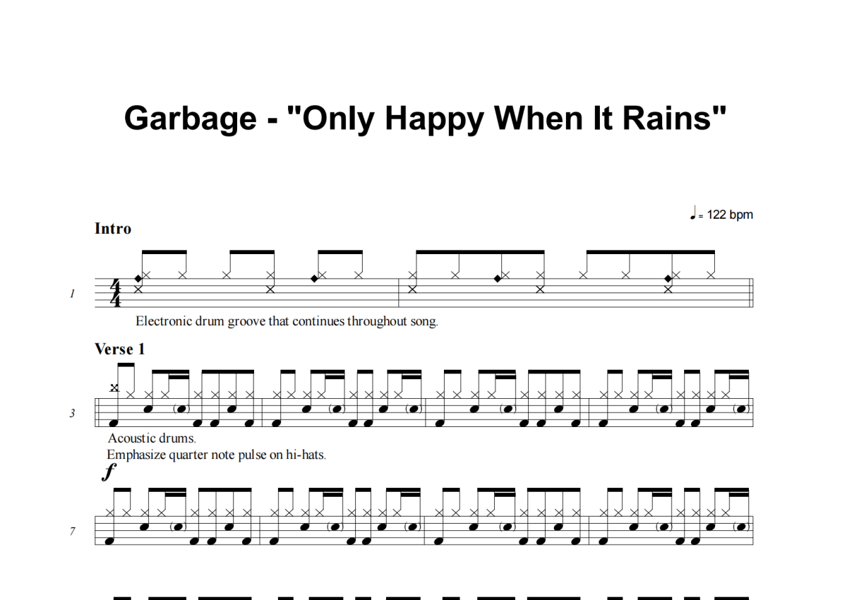 Garbage《Only Happy When It Rains》架子鼓谱