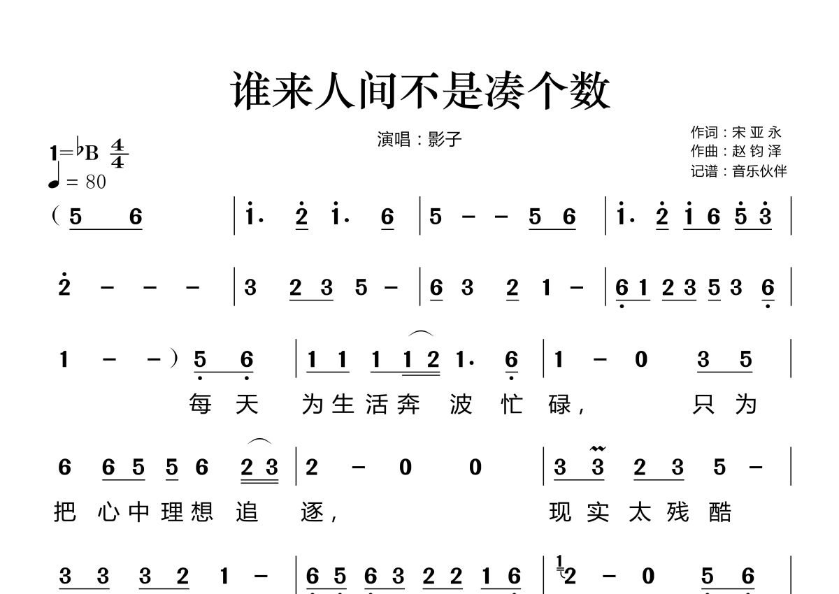 《谁来人间不是凑个数》是影子演唱的一首歌曲,拍号为4/4拍,歌曲速度为每分钟80拍,这份简谱共有两张高清图谱,图谱由 @音乐伙伴 编配上传。