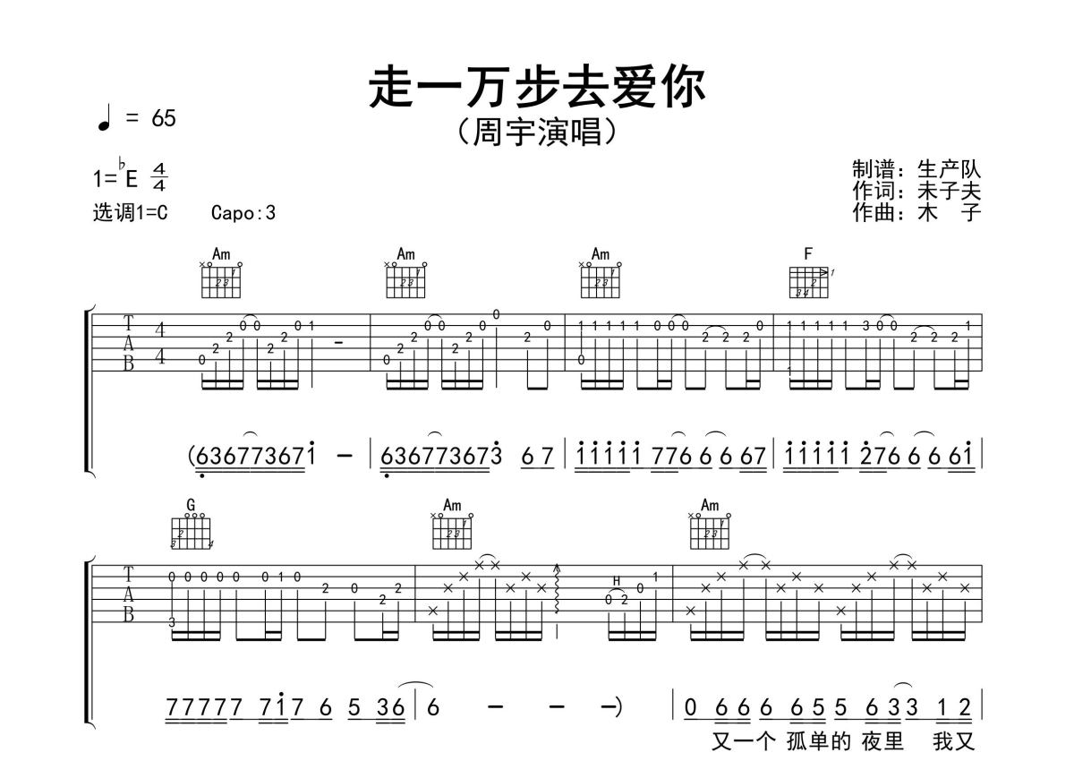 《走一万步去爱你》是周宇演唱的一首歌曲,精编完美版,拍号为4/4拍,歌曲速度为每分钟65拍,歌曲原调为Eb调,但由于原调指法比较难,为了方便弹奏,本吉他谱采用的是C调指法编配,变调夹3品弹奏即为原调,当然也可以根据自己的音域改变变调夹位置,或者通过改变和弦调性,以方便自己弹奏,这份吉他谱共有三张高清图谱,图谱由 @生产队 编配上传,图谱使用六线谱编配,包含吉他和弦指法、简谱以及歌词部分,使用这份走一万步去爱你吉他谱,可以让你更加方便地掌握这首歌曲的弹唱技巧,快来尝试吧。周宇演唱的歌曲《走一万步去爱你》原版吉他谱,含前奏、间奏、尾奏solo编配,精编完美版,值得推荐。