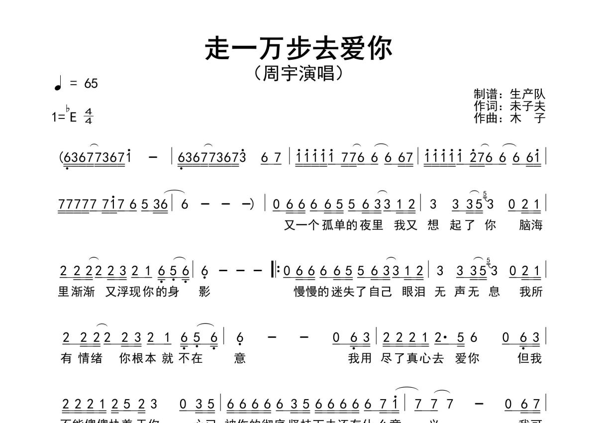 《走一万步去爱你》是周宇演唱的一首歌曲,原版简谱,拍号为4/4拍,歌曲速度为每分钟65拍,这份简谱共有一张高清图谱,图谱由 @生产队 编配上传周宇演唱的歌曲《走一万步去爱你》原版简谱,含前奏、间奏、尾奏solo编配,精编完美版,值得推荐。