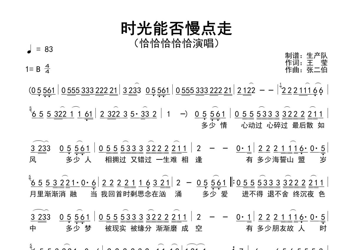 《时光能否慢点走》是恰恰恰恰恰演唱的一首歌曲,原版简谱,拍号为4/4拍,歌曲速度为每分钟83拍,这份简谱共有一张高清图谱,图谱由 @生产队 编配上传恰恰恰恰恰演唱的歌曲《时光能否慢点走》原版简谱,含前奏、间奏、尾奏solo编配,精编完美版,值得推荐。