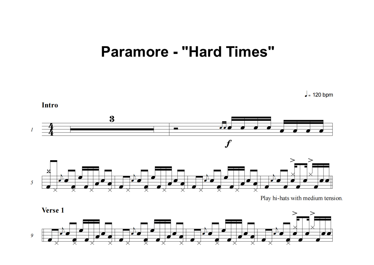《Hard Times》是Paramore演唱的一首歌曲,这份架子鼓谱共有四张高清图谱,图谱由 @失眠的土豆 编配上传,图谱使用五线谱编配,使用这份Hard Times架子鼓谱,你将能够轻松地敲打出这首Paramore的Hard Times,快来尝试吧。