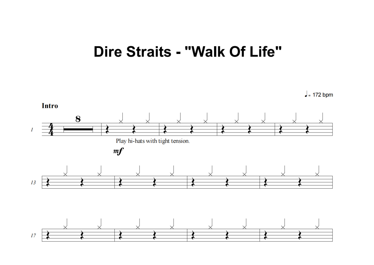 《Walk Of Life》是Dire Straits演唱的一首歌曲,这份架子鼓谱共有五张高清图谱,图谱由 @失眠的土豆 编配上传,图谱使用五线谱编配,使用这份Walk Of Life架子鼓谱,你将能够轻松地敲打出这首Dire Straits的Walk Of Life,快来尝试吧。