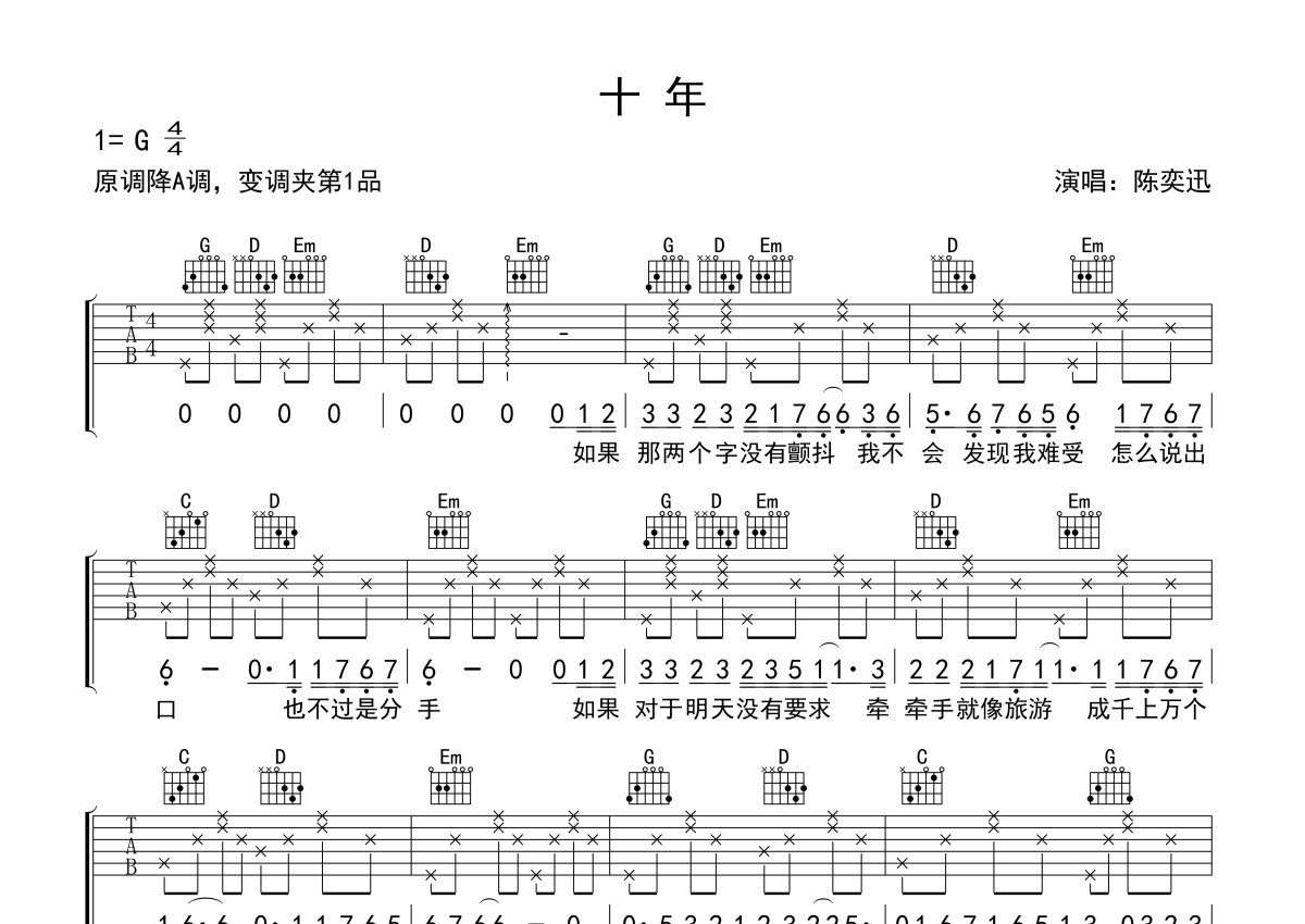 《十年》是陈奕迅演唱的一首歌曲,本吉他谱采用的是G调指法编配,这份吉他谱共有一张高清图谱,图谱由 @吉他专家 编配上传,图谱使用六线谱编配,包含吉他和弦指法、简谱以及歌词部分,使用这份十年吉他谱,可以让你更加方便地掌握这首歌曲的弹唱技巧,快来尝试吧。原调bA,编配调G调,变调夹夹一品。 人生有多少个十年,人生又有多少个路过与相遇,大浪淘沙,能留下的有多少,每个十年都有美好与遗憾珍惜,感恩你所经历的一切吧。
