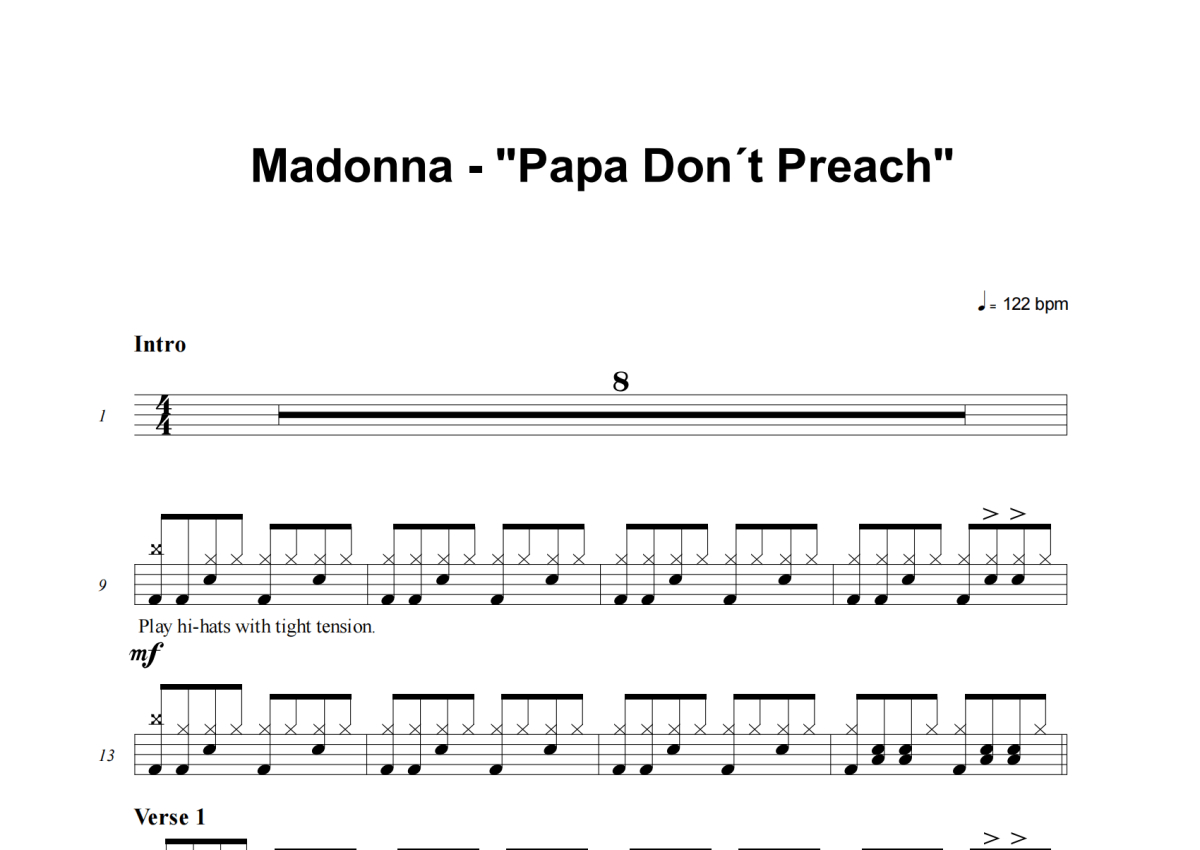 《Papa Don't Preach》是Madonna演唱的一首歌曲,这份架子鼓谱共有五张高清图谱,图谱由 @失眠的土豆 编配上传,图谱使用五线谱编配,使用这份Papa Don't Preach架子鼓谱,你将能够轻松地敲打出这首Madonna的Papa Don't Preach,快来尝试吧。