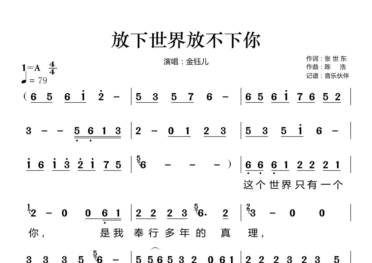 《放下世界放不下你》是金钰儿演唱的一首歌曲,拍号为4/4拍,歌曲速度为每分钟79拍,这份简谱共有两张高清图谱,图谱由 @音乐伙伴 编配上传。