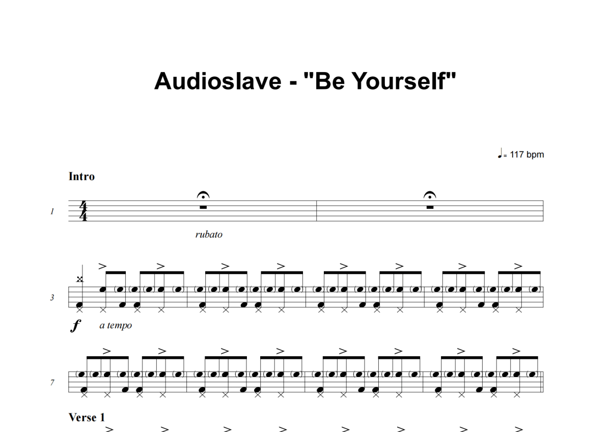 《Be Yourself》是Audioslave演唱的一首歌曲,这份架子鼓谱共有四张高清图谱,图谱由 @失眠的土豆 编配上传,图谱使用五线谱编配,使用这份Be Yourself架子鼓谱,你将能够轻松地敲打出这首Audioslave的Be Yourself,快来尝试吧。