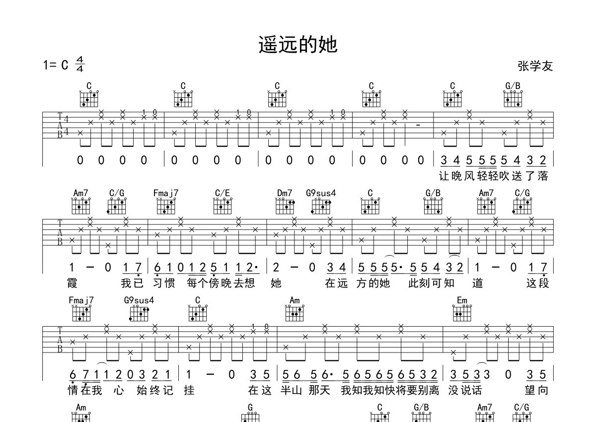 张学友《遥远的她》吉他谱 - C调弹唱六线谱