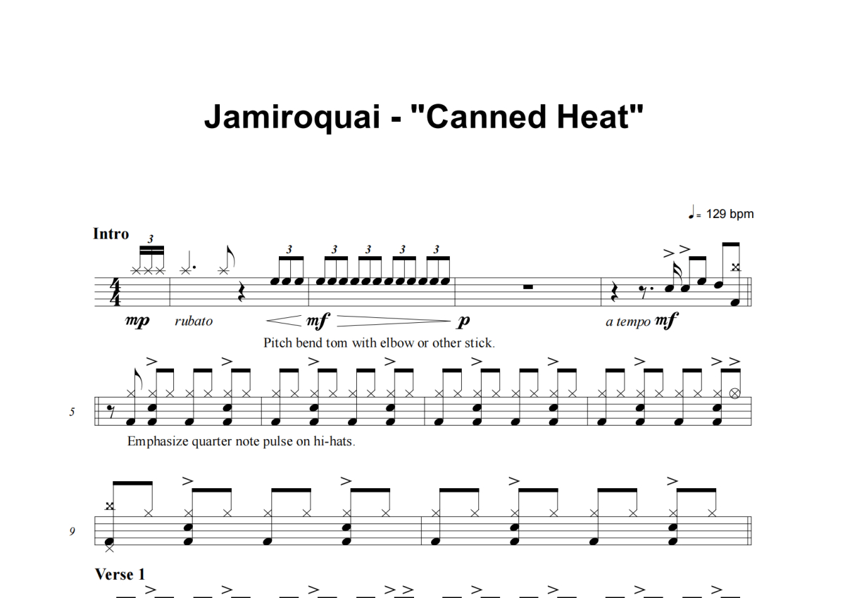 《Canned Heat》是Jamiroquai演唱的一首歌曲,这份架子鼓谱共有四张高清图谱,图谱由 @失眠的土豆 编配上传,图谱使用五线谱编配,使用这份Canned Heat架子鼓谱,你将能够轻松地敲打出这首Jamiroquai的Canned Heat,快来尝试吧。
