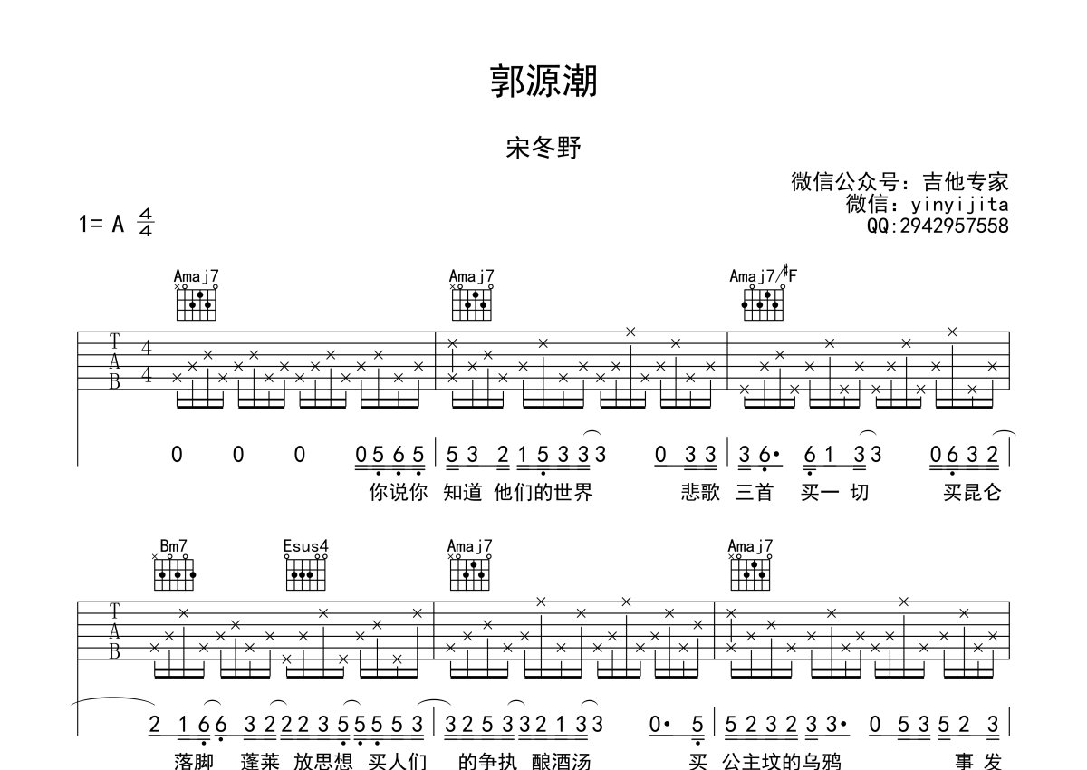 《郭源潮》是宋冬野演唱的一首歌曲,本吉他谱采用的是A调指法编配,这份吉他谱共有两张高清图谱,图谱由 @吉他专家 编配上传,图谱使用六线谱编配,包含吉他和弦指法、简谱以及歌词部分,使用这份郭源潮吉他谱,可以让你更加方便地掌握这首歌曲的弹唱技巧,快来尝试吧。宋冬野凌晨在微博上发了这一首歌,依旧是民谣曲风,还是熟悉的味道,歌名为《郭源潮》。不久前的风波,也许会让他的心境变得很复杂,歌词中“层楼终究误少年,自由早晚乱余生,你我山前没相见,山后别相逢”这一句,很有意味。编配者:PS:和弦BM7+11和E7sus4这两个和弦按法其实是一样的,但是考虑到和弦本质还是写成两个名字,大家不要被和弦图部分长长的名字吓到。