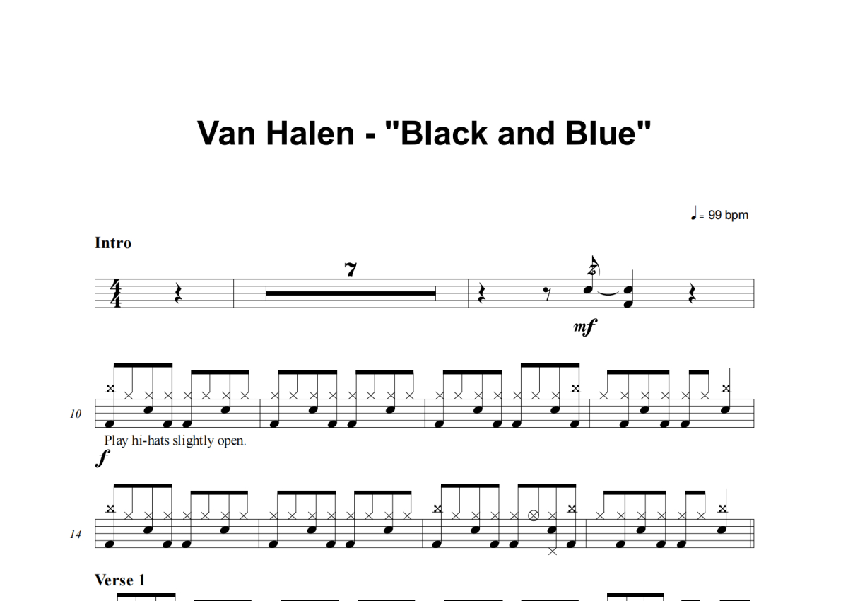《Black And Blue》是Van Halen演唱的一首歌曲,这份架子鼓谱共有四张高清图谱,图谱由 @失眠的土豆 编配上传,图谱使用五线谱编配,使用这份Black And Blue架子鼓谱,你将能够轻松地敲打出这首Van Halen的Black And Blue,快来尝试吧。