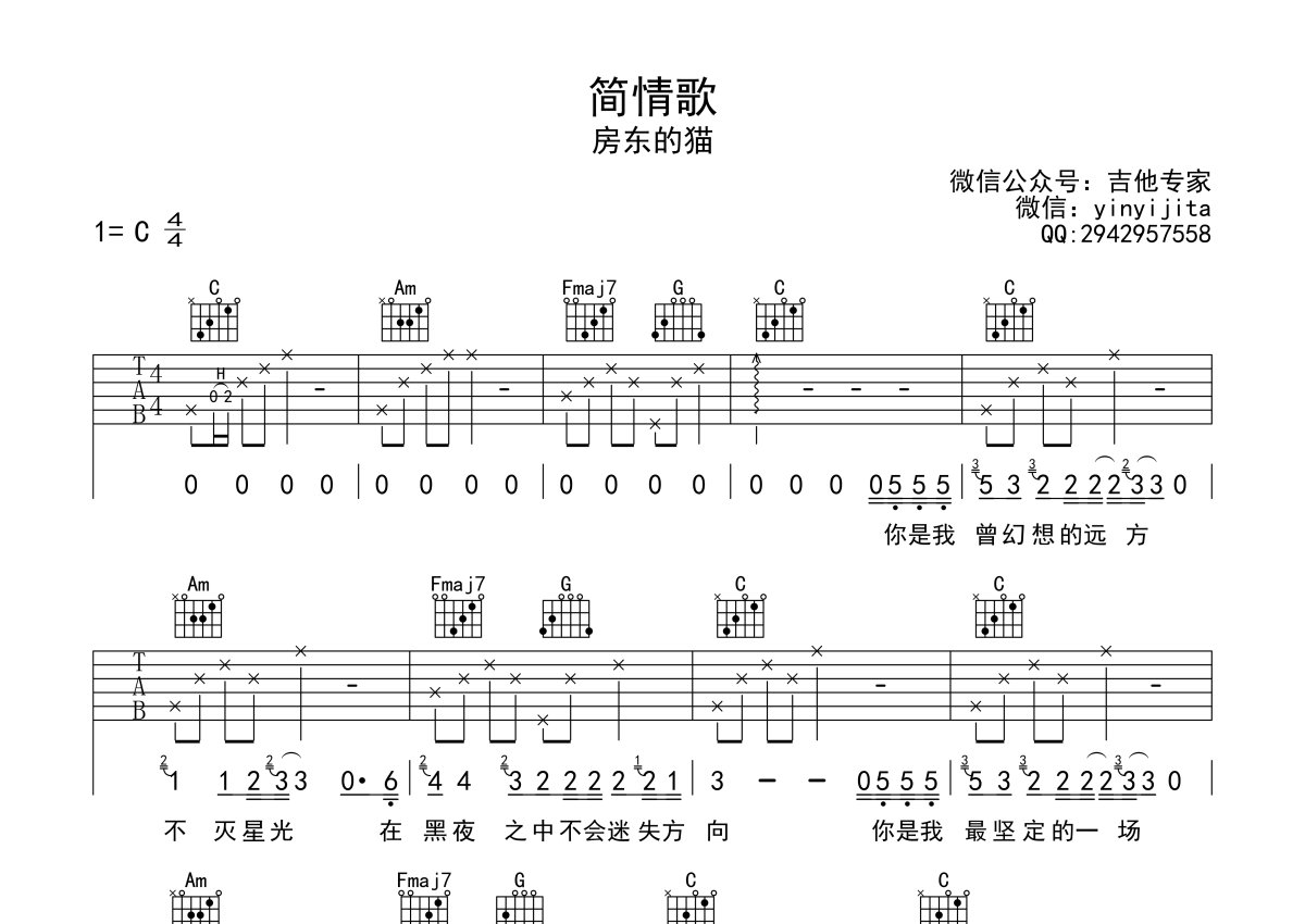 房东的猫《简情歌》吉他谱 - C调弹唱六线谱