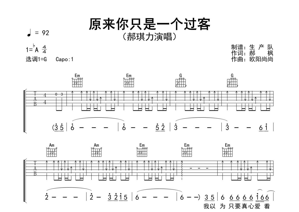 《原来你只是一个过客》是郝琪力演唱的一首歌曲,精编完美版,拍号为4/4拍,歌曲速度为每分钟92拍,歌曲原调为Ab调,但由于原调指法比较难,为了方便弹奏,本吉他谱采用的是G调指法编配,变调夹1品弹奏即为原调,当然也可以根据自己的音域改变变调夹位置,或者通过改变和弦调性,以方便自己弹奏,这份吉他谱共有三张高清图谱,图谱由 @生产队 编配上传,图谱使用六线谱编配,包含吉他和弦指法、简谱以及歌词部分,使用这份原来你只是一个过客吉他谱,可以让你更加方便地掌握这首歌曲的弹唱技巧,快来尝试吧。郝琪力演唱的歌曲《原来你只是一个过客》原版吉他谱,含前奏、间奏solo编配,精编完美版,怀旧经典!。