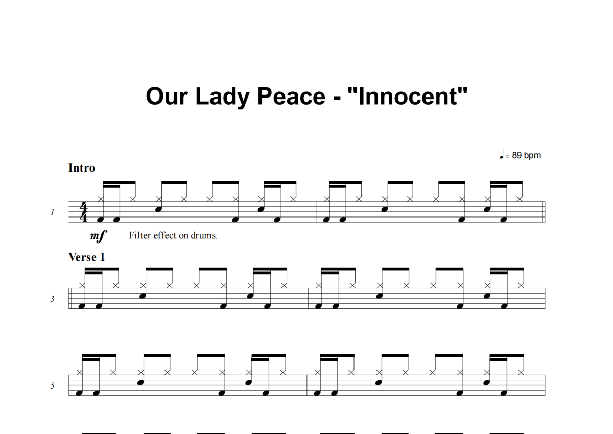 《Innocent》是Our Lady Peace演唱的一首歌曲,这份架子鼓谱共有五张高清图谱,图谱由 @失眠的土豆 编配上传,图谱使用五线谱编配,使用这份Innocent架子鼓谱,你将能够轻松地敲打出这首Our Lady Peace的Innocent,快来尝试吧。