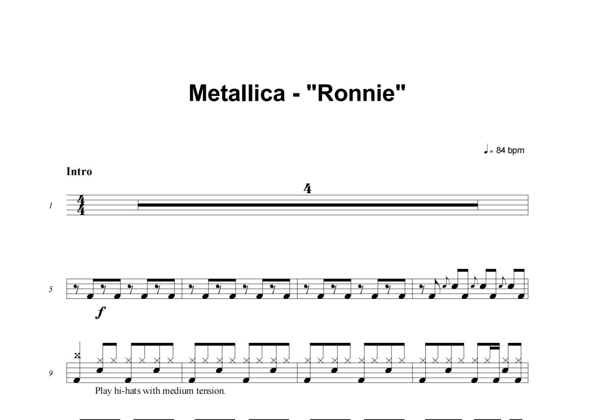 《Ronnie》是Metallica演唱的一首歌曲,这份架子鼓谱共有五张高清图谱,图谱由 @失眠的土豆 编配上传,图谱使用五线谱编配,使用这份Ronnie架子鼓谱,你将能够轻松地敲打出这首Metallica的Ronnie,快来尝试吧。