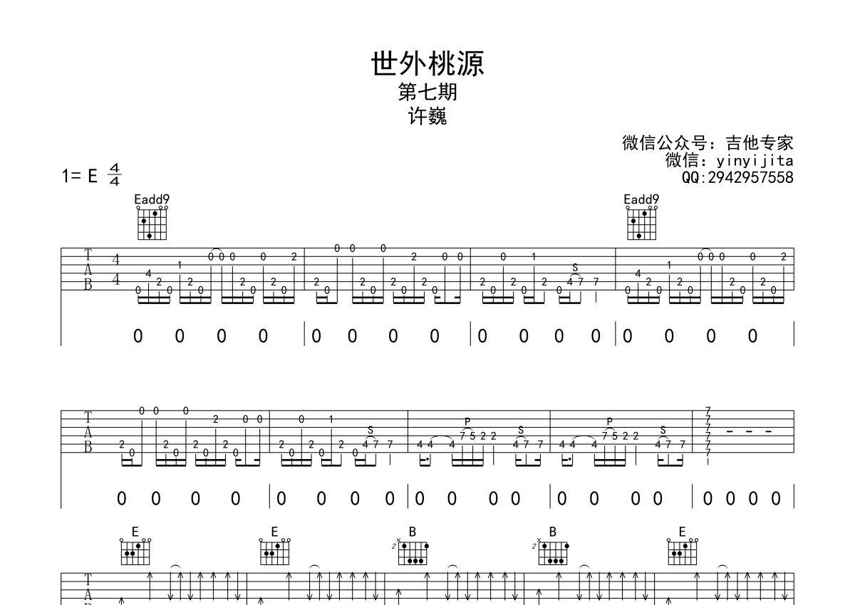 许巍《世外桃源》吉他谱 - E调弹唱六线谱