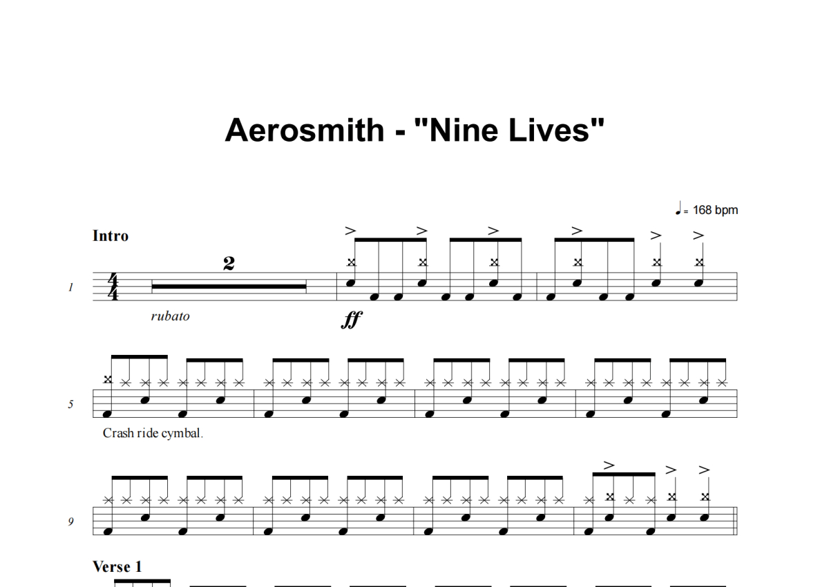 《Nine Lives》是Aerosmith演唱的一首歌曲,这份架子鼓谱共有五张高清图谱,图谱由 @失眠的土豆 编配上传,图谱使用五线谱编配,使用这份Nine Lives架子鼓谱,你将能够轻松地敲打出这首Aerosmith的Nine Lives,快来尝试吧。
