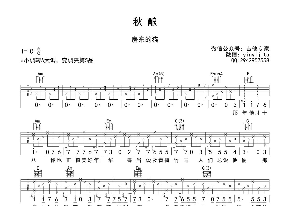 房东的猫《秋酿》吉他谱 - A调弹唱六线谱