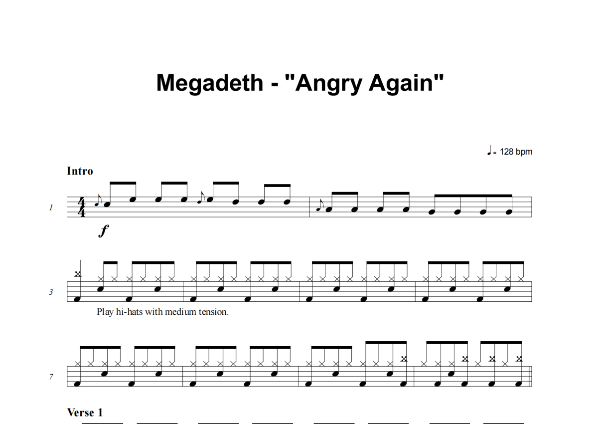 《Angry Again》是Megadeth演唱的一首歌曲,这份架子鼓谱共有四张高清图谱,图谱由 @失眠的土豆 编配上传,图谱使用五线谱编配,使用这份Angry Again架子鼓谱,你将能够轻松地敲打出这首Megadeth的Angry Again,快来尝试吧。