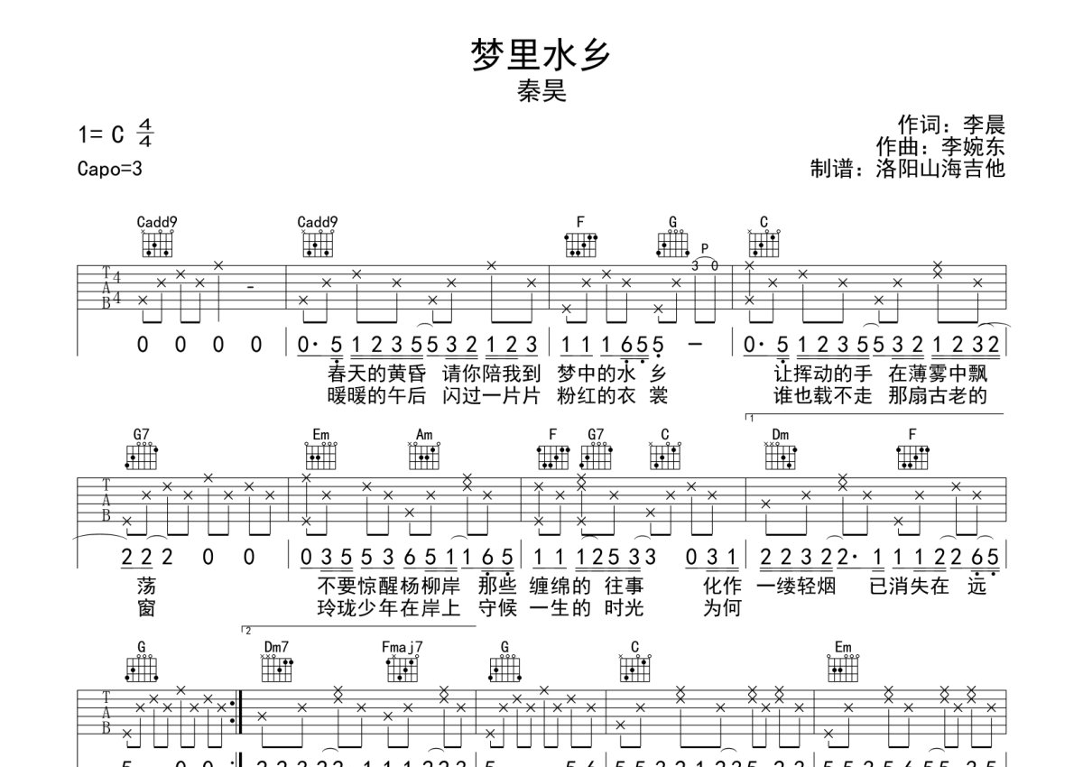 秦昊《梦里水乡》吉他谱 - C调弹唱六线谱