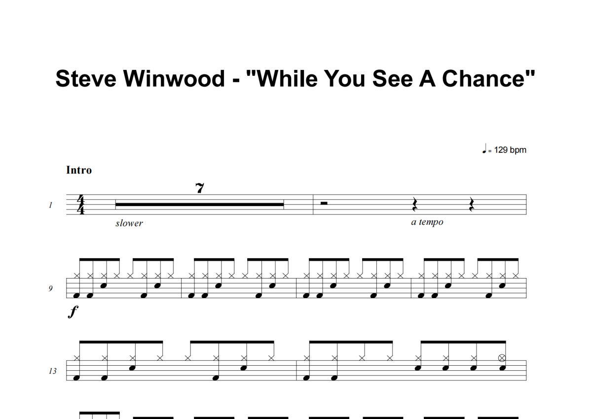 《While You See A Chance》是Steve Winwood演唱的一首歌曲,这份架子鼓谱共有五张高清图谱,图谱由 @失眠的土豆 编配上传,图谱使用五线谱编配,使用这份While You See A Chance架子鼓谱,你将能够轻松地敲打出这首Steve Winwood的While You See A Chance,快来尝试吧。