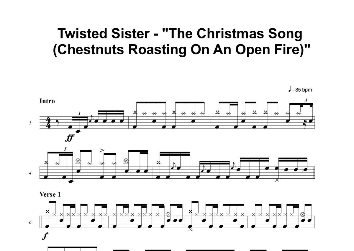 《The Christmas Song (Chestnuts Roasting On An Open Fire)》是Twisted Sister演唱的一首歌曲,这份架子鼓谱共有四张高清图谱,图谱由 @失眠的土豆 编配上传,图谱使用五线谱编配,使用这份The Christmas Song (Chestnuts Roasting On An Open Fire)架子鼓谱,你将能够轻松地敲打出这首Twisted Sister的The Christmas Song (Chestnuts Roasting On An Open Fire),快来尝试吧。