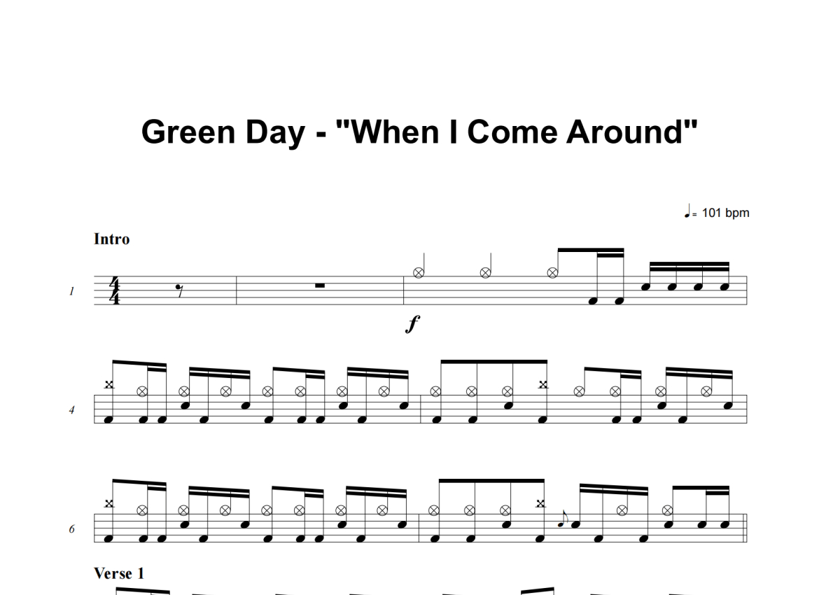 《When I Come Around》是Green Day演唱的一首歌曲,这份架子鼓谱共有五张高清图谱,图谱由 @失眠的土豆 编配上传,图谱使用五线谱编配,使用这份When I Come Around架子鼓谱,你将能够轻松地敲打出这首Green Day的When I Come Around,快来尝试吧。