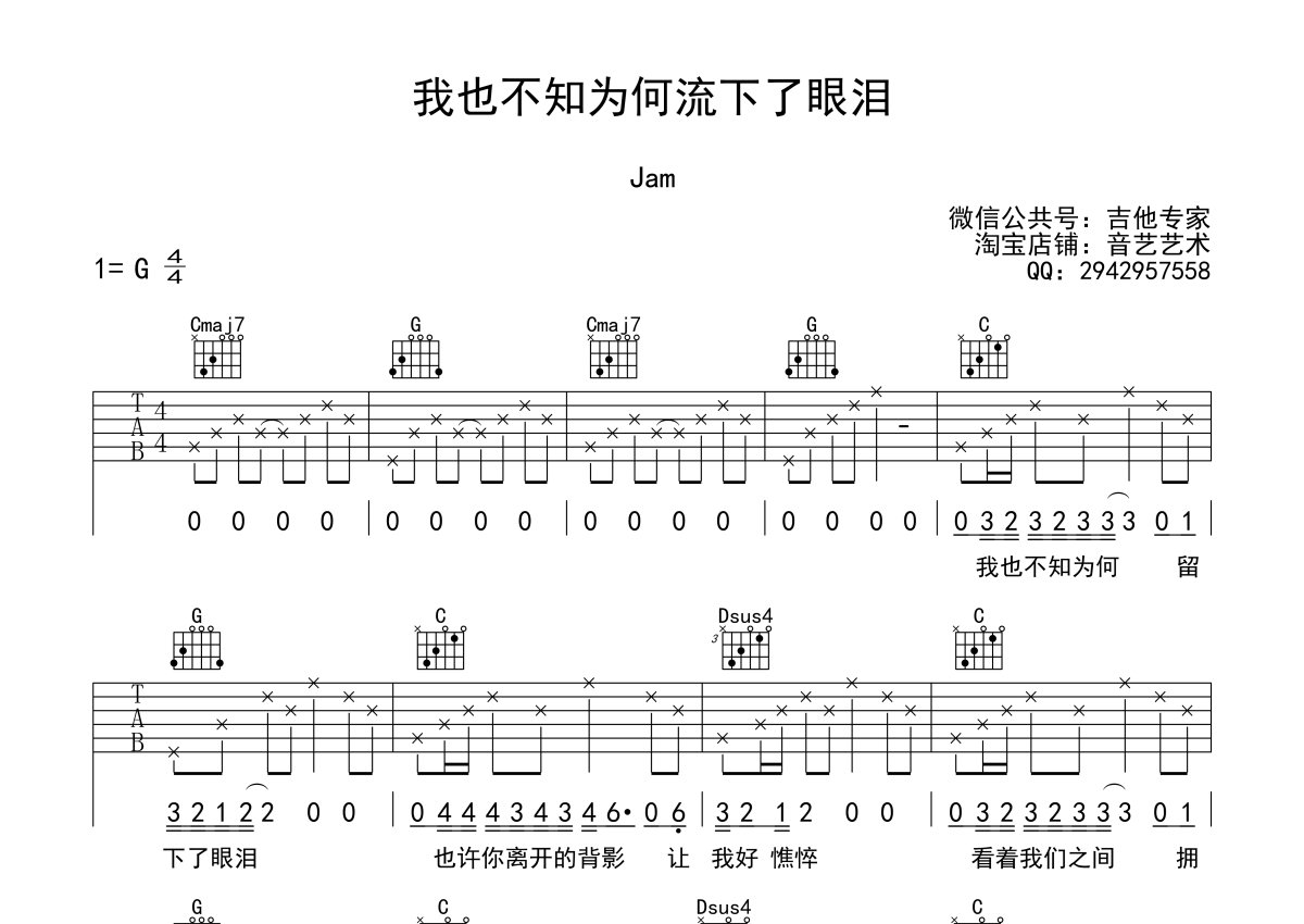 Jam(阿敬)《我也不知为何流下了眼泪》吉他谱 - G调弹唱六线谱
