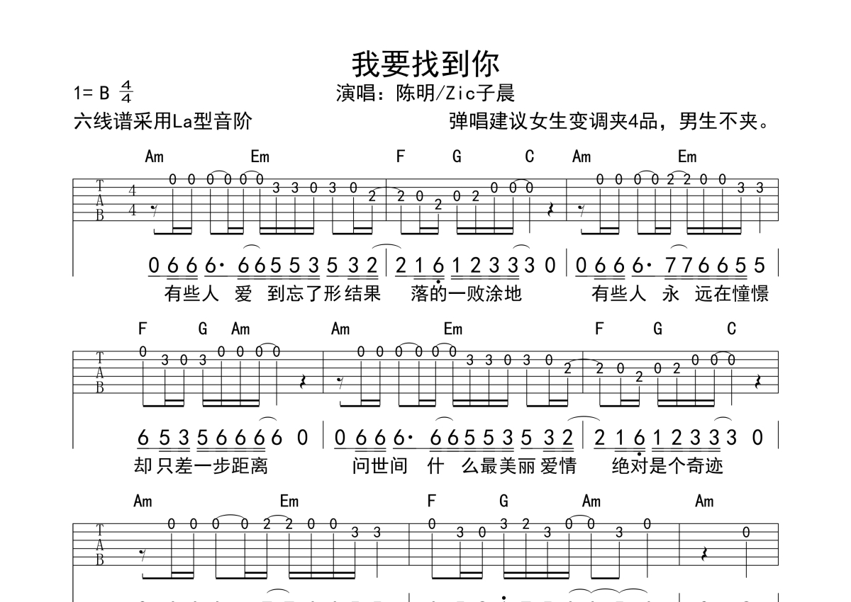 陈明/Zic子晨《我要找到你》吉他谱 - G调独奏solo六线谱