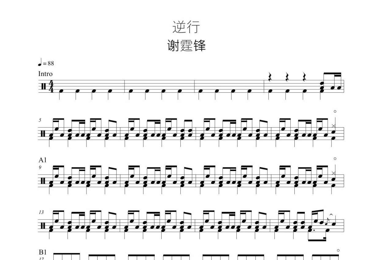《逆行》是谢霆锋演唱的一首歌曲,现场版,这份架子鼓谱共有三张高清图谱,图谱由 @Breaken_cheung 编配上传,图谱使用五线谱编配,使用这份逆行架子鼓谱,你将能够轻松地敲打出这首谢霆锋的逆行,快来尝试吧。
