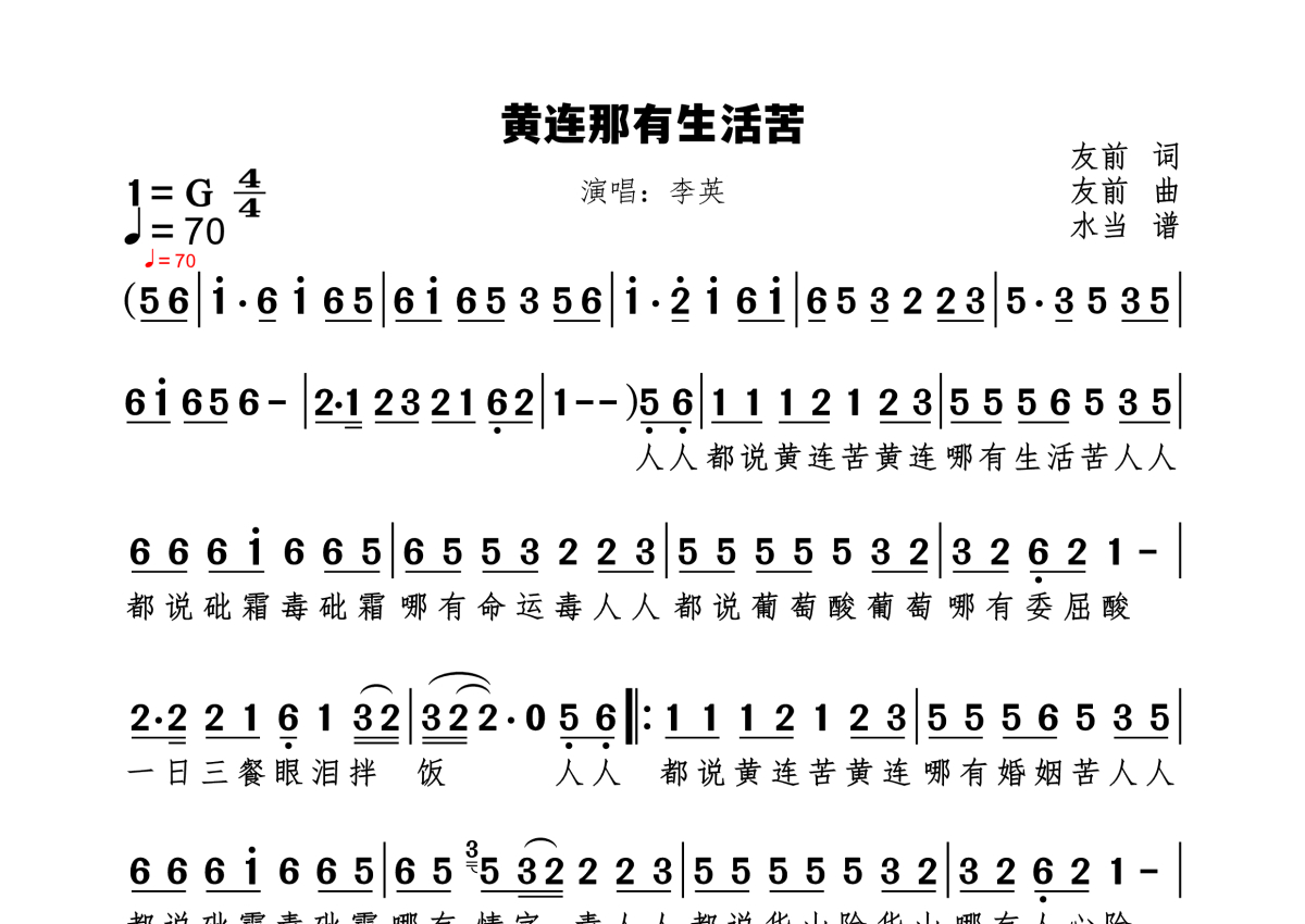 《黄连哪有生活苦》是李英演唱的一首歌曲,拍号为4/4拍,歌曲速度为每分钟70拍,这份简谱共有一张高清图谱,图谱由 @水当 编配上传原调G。