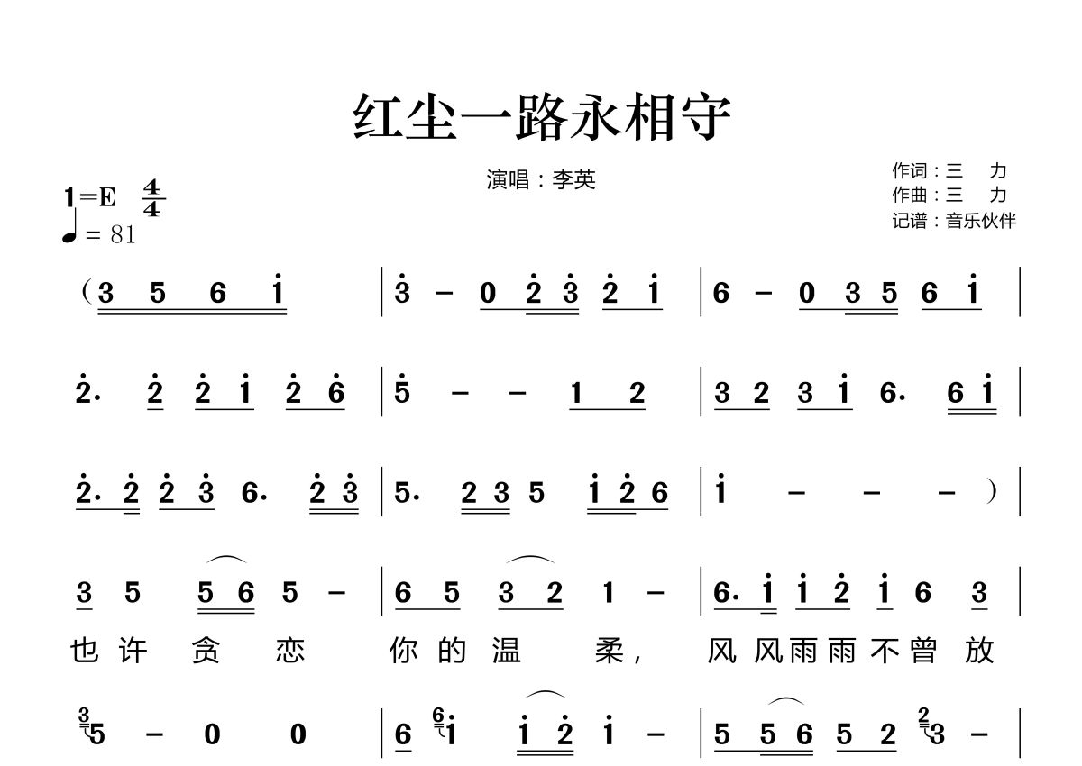 红尘一路永相守简谱 - 李英演唱