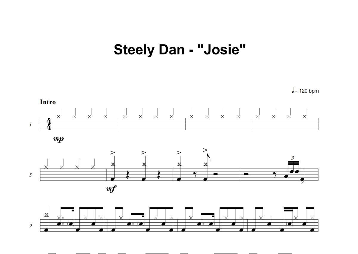 《Josie》是Steely Dan演唱的一首歌曲,这份架子鼓谱共有四张高清图谱,图谱由 @失眠的土豆 编配上传,图谱使用五线谱编配,使用这份Josie架子鼓谱,你将能够轻松地敲打出这首Steely Dan的Josie,快来尝试吧。