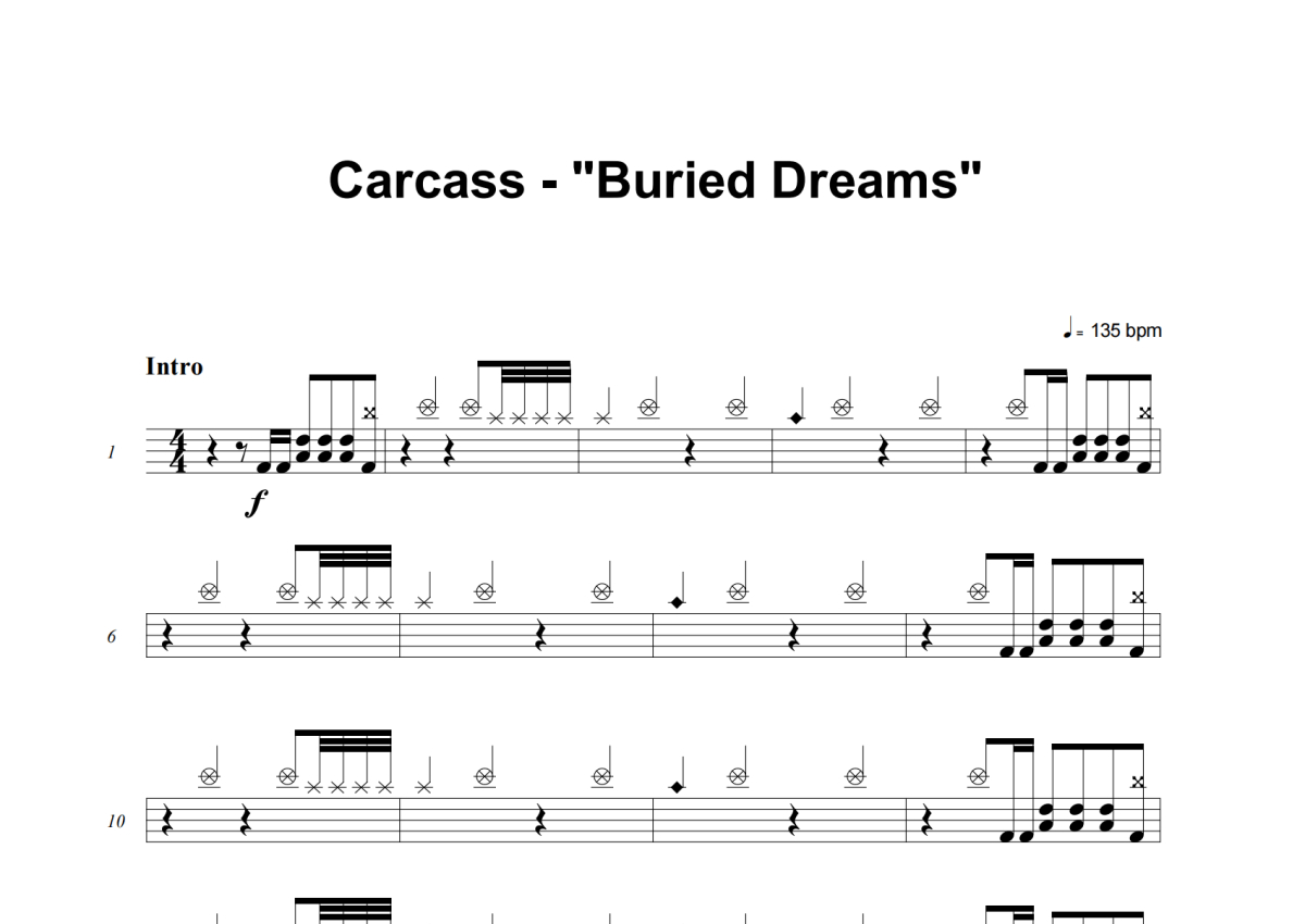 《Buried Dreams》是Carcass演唱的一首歌曲,这份架子鼓谱共有五张高清图谱,图谱由 @失眠的土豆 编配上传,图谱使用五线谱编配,使用这份Buried Dreams架子鼓谱,你将能够轻松地敲打出这首Carcass的Buried Dreams,快来尝试吧。