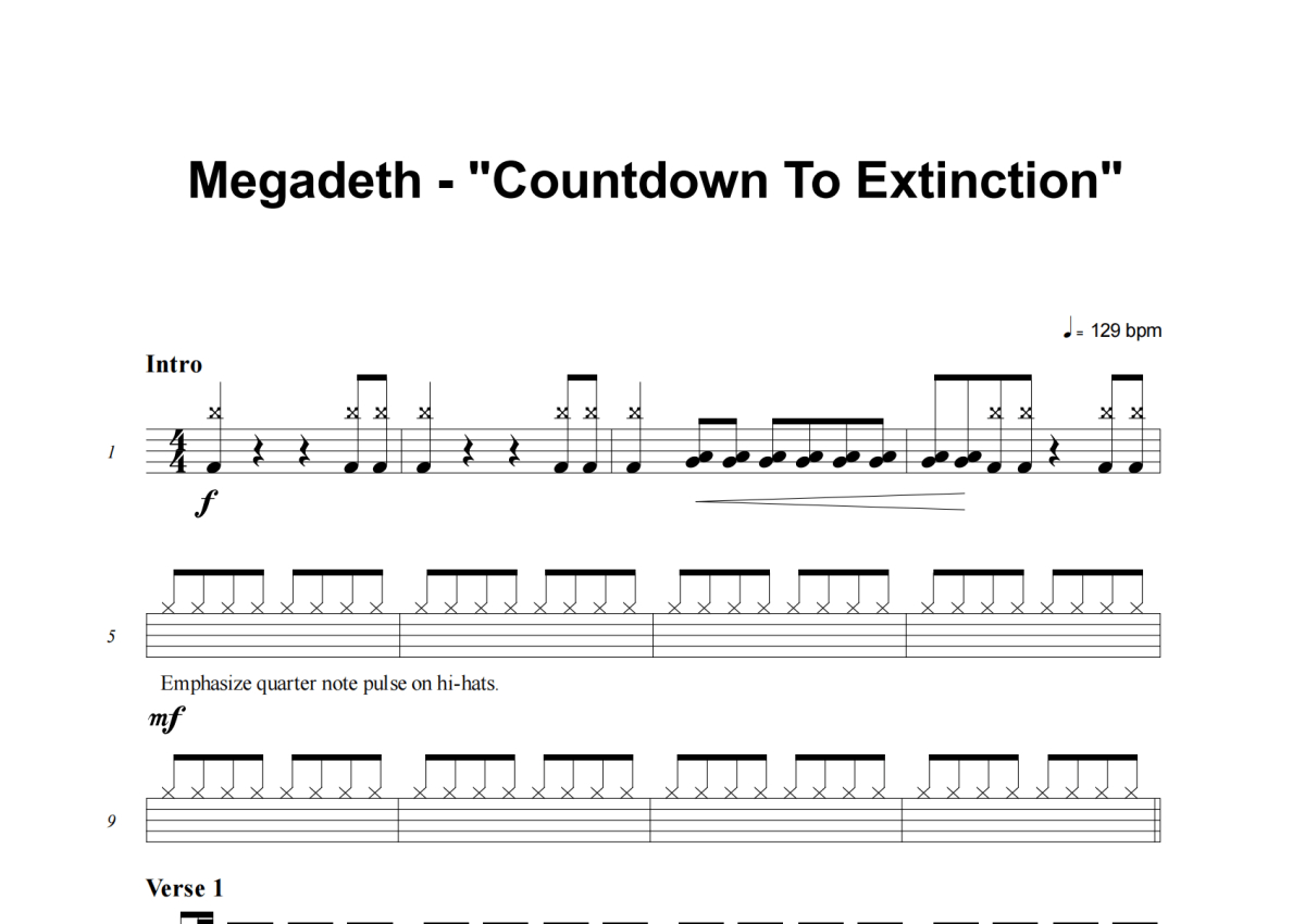 《Countdown To Extinction》是Megadeth演唱的一首歌曲,这份架子鼓谱共有五张高清图谱,图谱由 @失眠的土豆 编配上传,图谱使用五线谱编配,使用这份Countdown To Extinction架子鼓谱,你将能够轻松地敲打出这首Megadeth的Countdown To Extinction,快来尝试吧。