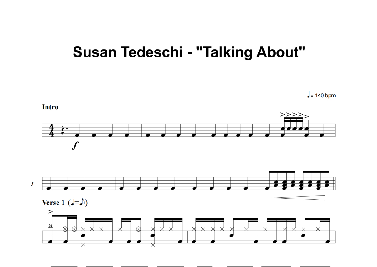 《Talking About》是Susan Tedeschi演唱的一首歌曲,这份架子鼓谱共有五张高清图谱,图谱由 @失眠的土豆 编配上传,图谱使用五线谱编配,使用这份Talking About架子鼓谱,你将能够轻松地敲打出这首Susan Tedeschi的Talking About,快来尝试吧。