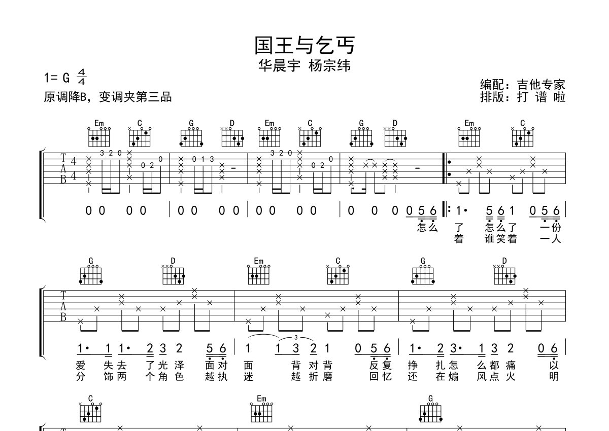 杨宗纬/华晨宇《国王与乞丐》吉他谱 - G调弹唱六线谱