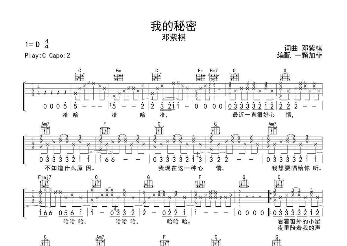 《我的秘密》是邓紫棋演唱的一首歌曲,拍号为4/4拍,歌曲原调为D调,但由于原调指法比较难,为了方便弹奏,本吉他谱采用的是C调指法编配,变调夹2品弹奏即为原调,当然也可以根据自己的音域改变变调夹位置,或者通过改变和弦调性,以方便自己弹奏,这份吉他谱共有两张高清图谱,图谱由 @一颗加菲 编配上传,图谱使用六线谱编配,包含吉他和弦指法、简谱以及歌词部分,曲谱配备了相关的音频提供试听,使用这份我的秘密吉他谱,可以让你更加方便地掌握这首歌曲的弹唱技巧,快来尝试吧。