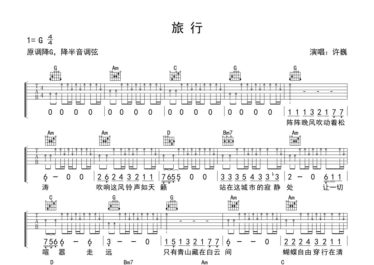 许巍《旅行》吉他谱 - G调弹唱六线谱