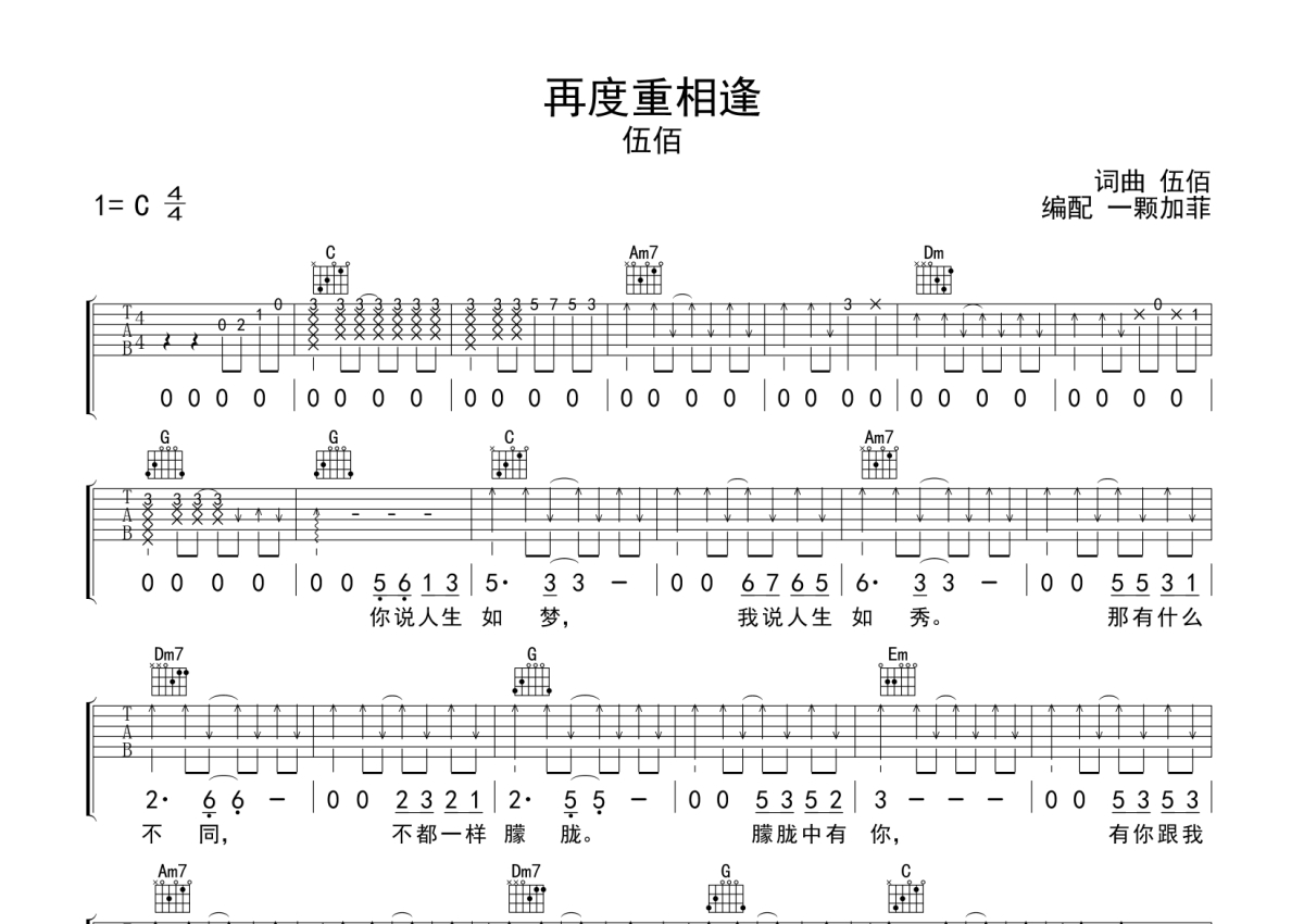 再度重相逢吉他谱 - 伍佰演唱 - C调弹唱六线谱