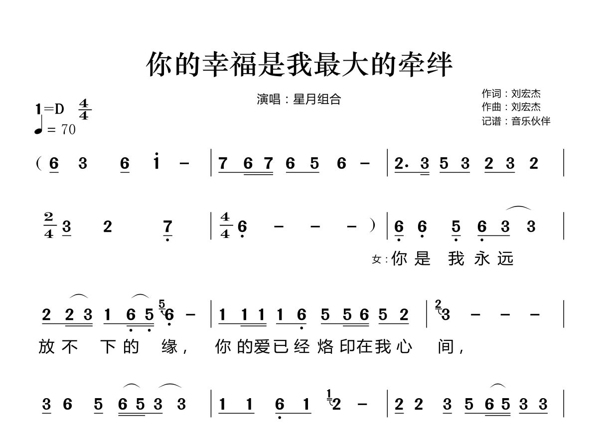 《你的幸福是我最大的牵绊》是星月组合演唱的一首歌曲,拍号为4/4拍,歌曲速度为每分钟70拍,这份简谱共有两张高清图谱,图谱由 @音乐伙伴 编配上传。