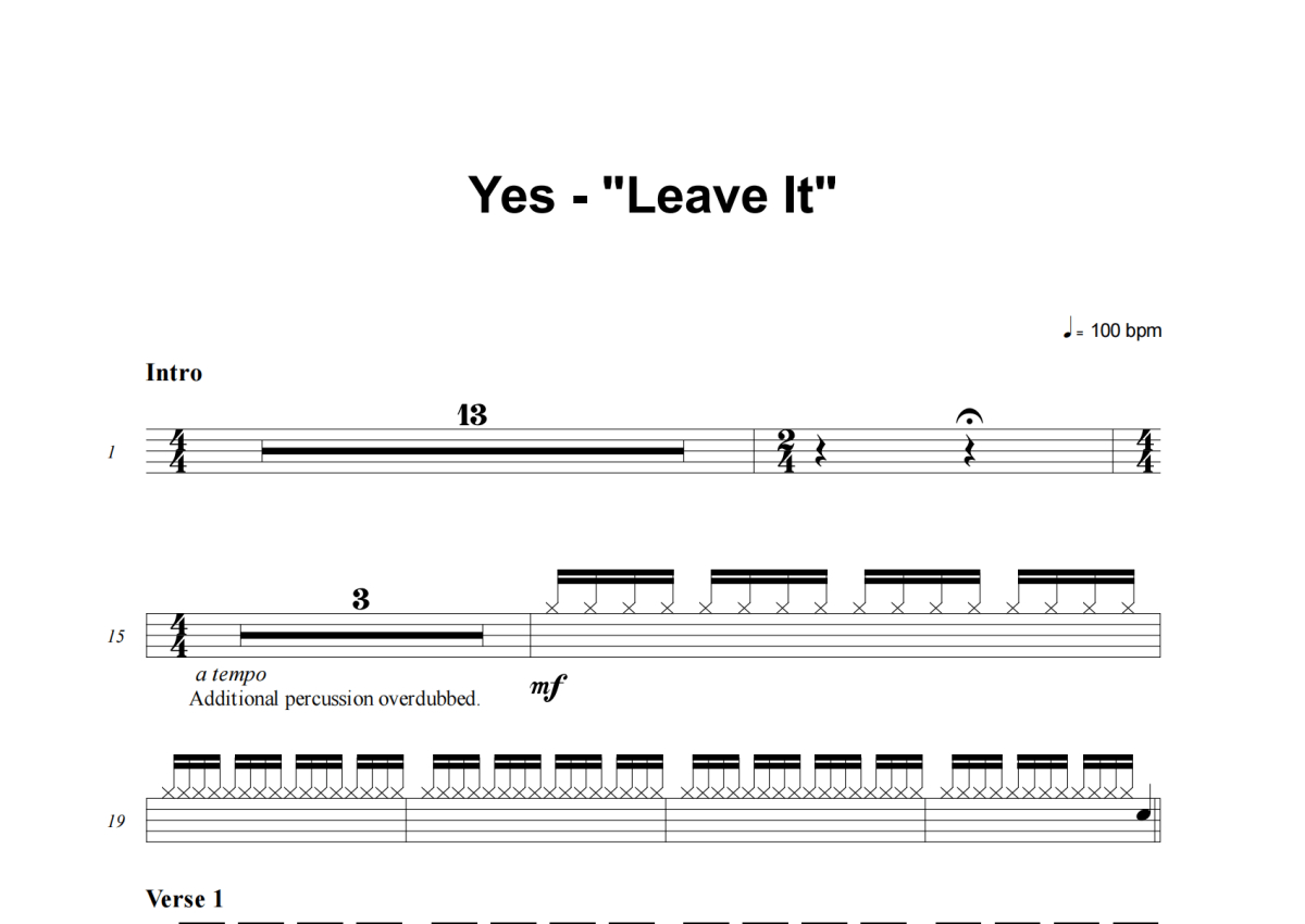 《Leave It》是Yes演唱的一首歌曲,这份架子鼓谱共有五张高清图谱,图谱由 @失眠的土豆 编配上传,图谱使用五线谱编配,使用这份Leave It架子鼓谱,你将能够轻松地敲打出这首Yes的Leave It,快来尝试吧。
