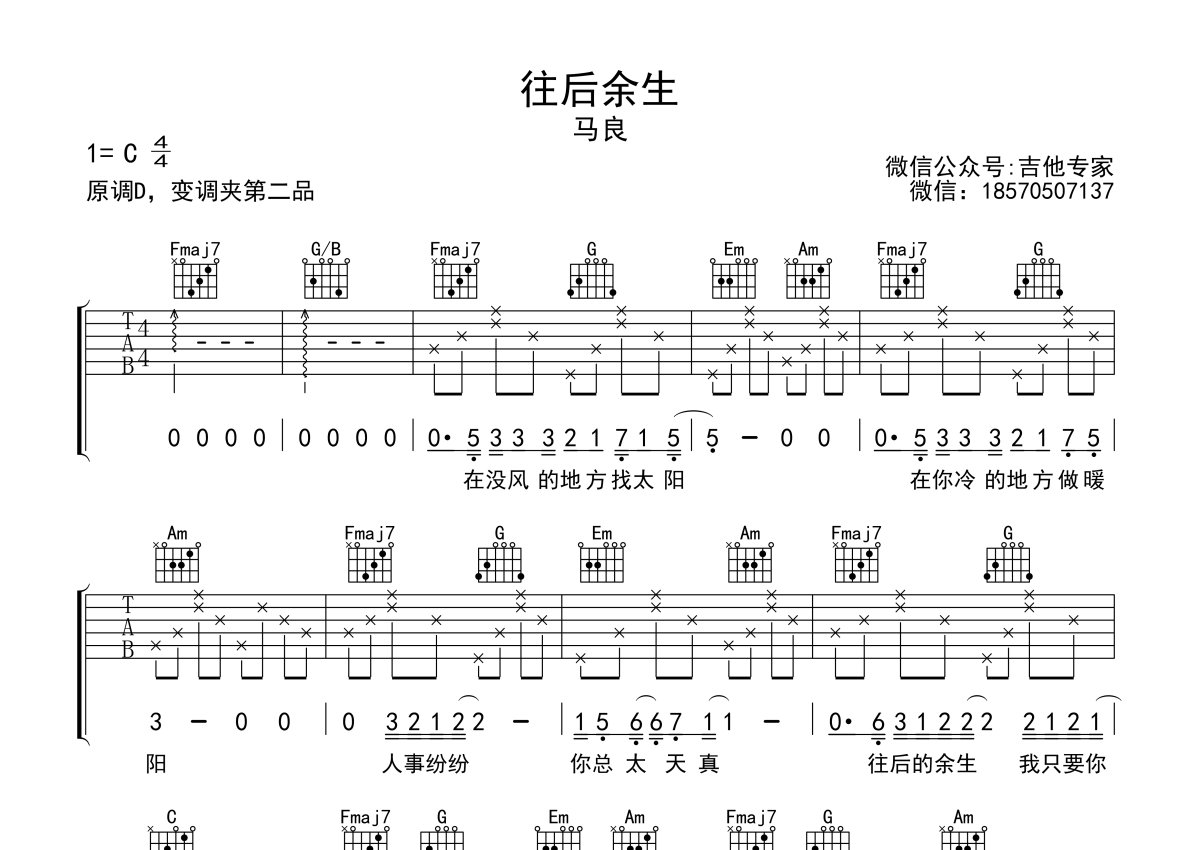 马良《往后余生》吉他谱 - C调弹唱六线谱