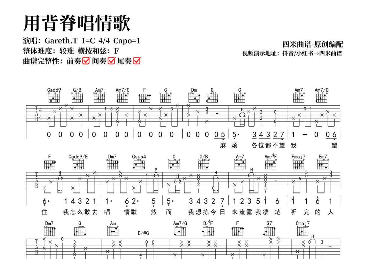 Gareth.T《用背脊唱情歌》吉他谱 - C调弹唱六线谱