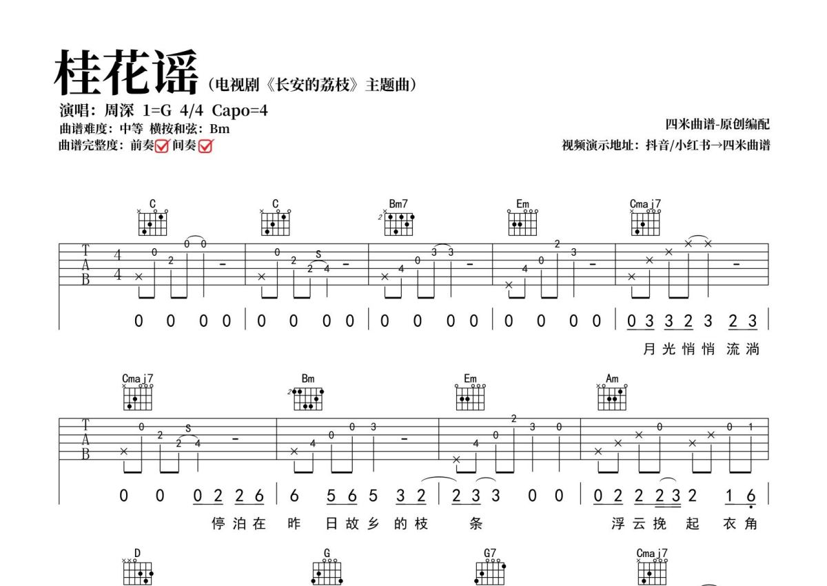 周深《桂花谣》吉他谱 - G调弹唱六线谱