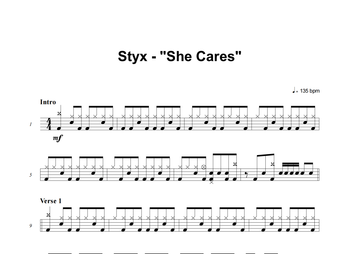 《She Cares》是Styx演唱的一首歌曲,这份架子鼓谱共有五张高清图谱,图谱由 @失眠的土豆 编配上传,图谱使用五线谱编配,使用这份She Cares架子鼓谱,你将能够轻松地敲打出这首Styx的She Cares,快来尝试吧。