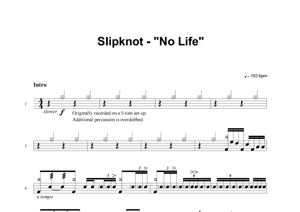 《No Life》是Slipknot演唱的一首歌曲,这份架子鼓谱共有五张高清图谱,图谱由 @失眠的土豆 编配上传,图谱使用五线谱编配,使用这份No Life架子鼓谱,你将能够轻松地敲打出这首Slipknot的No Life,快来尝试吧。