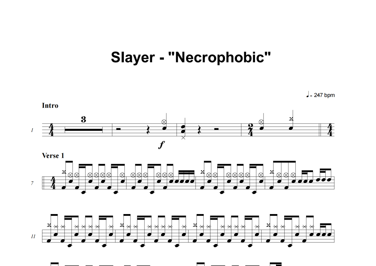 《Necrophobic》是Slayer演唱的一首歌曲,这份架子鼓谱共有三张高清图谱,图谱由 @失眠的土豆 编配上传,图谱使用五线谱编配,使用这份Necrophobic架子鼓谱,你将能够轻松地敲打出这首Slayer的Necrophobic,快来尝试吧。