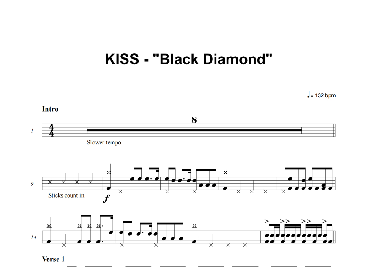 《Black Diamond》是KISS演唱的一首歌曲,这份架子鼓谱共有五张高清图谱,图谱由 @失眠的土豆 编配上传,图谱使用五线谱编配,使用这份Black Diamond架子鼓谱,你将能够轻松地敲打出这首KISS的Black Diamond,快来尝试吧。
